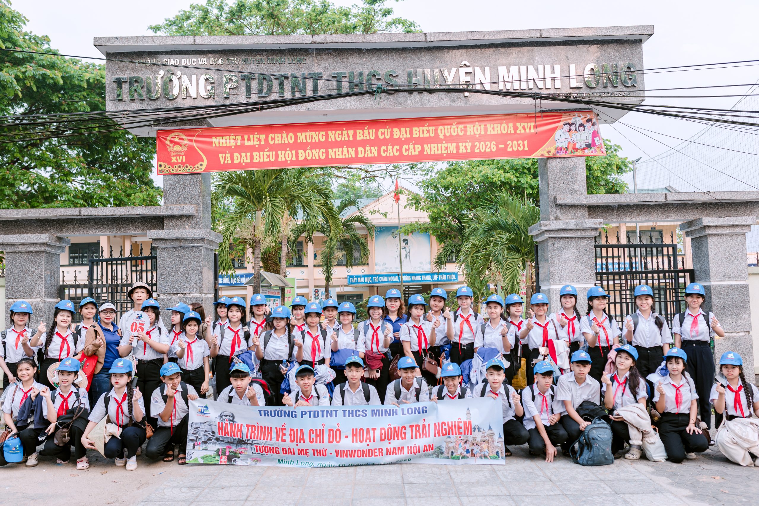 Ngày 10/04/2026, Trường PTDTNT THCS Minh Long đã tổ chức chương trình “Hành trình về địa chỉ đỏ” đầy ý nghĩa, kết hợp hoạt động học tập và trải nghiệm dành cho học sinh toàn trường. Hành trình đưa các em đến dâng hương tại Tượng đài Mẹ Thứ và tham gia hoạt động trải nghiệm tại VinWonders Nam Hội An.